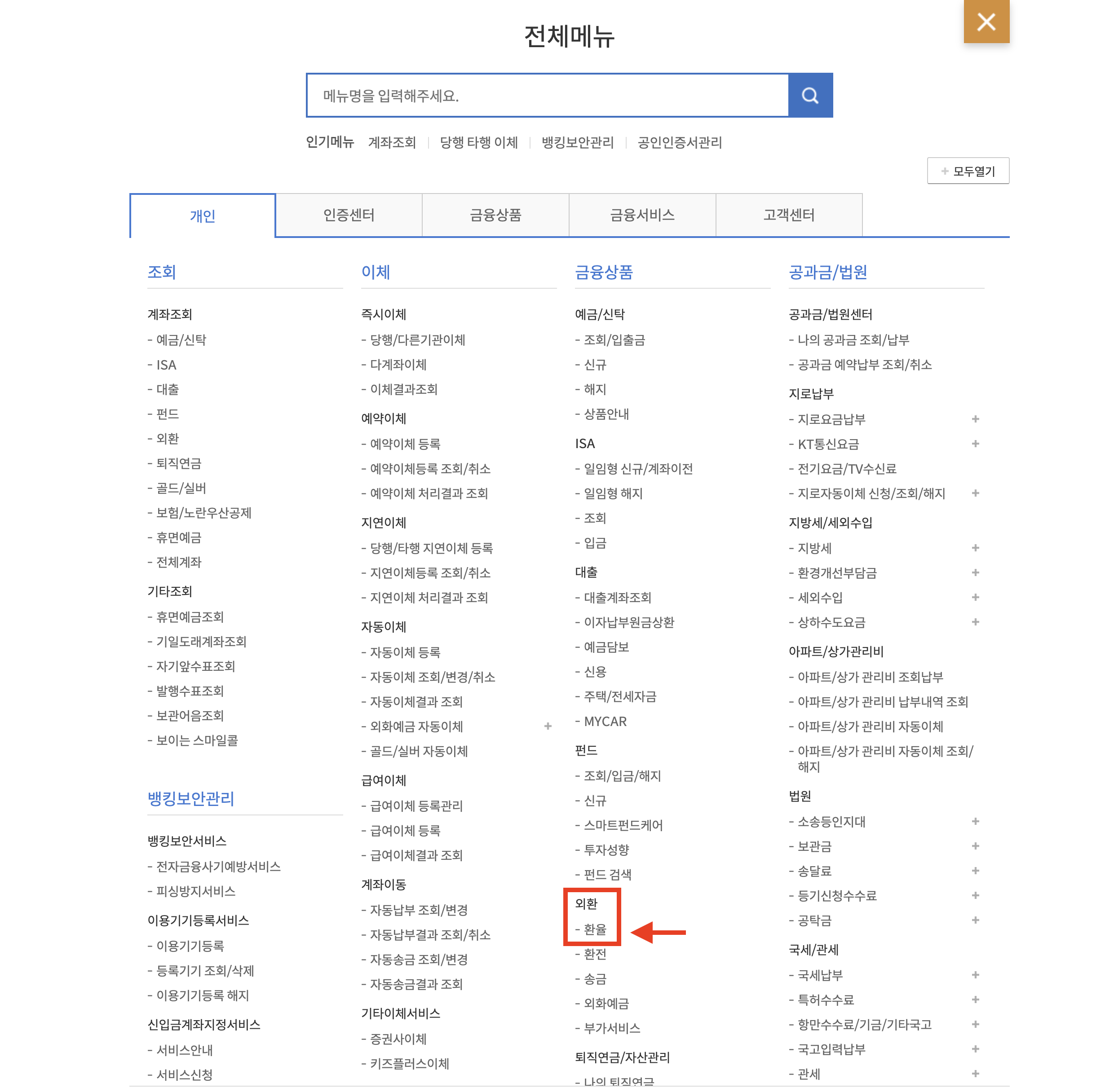 - 로그인 후, 하단 메뉴에서 ‘환율/외환’ 항목을 선택합니다.